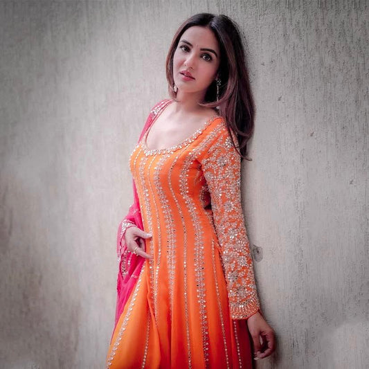 Shivali- Orange Sequence Embroidered Heavy Georgette Gown with Plazzo & Dupatta