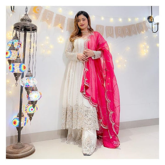 Shivali- Off White Sequence Embroidered Heavy Georgette Gown with Plazzo & Dupatta