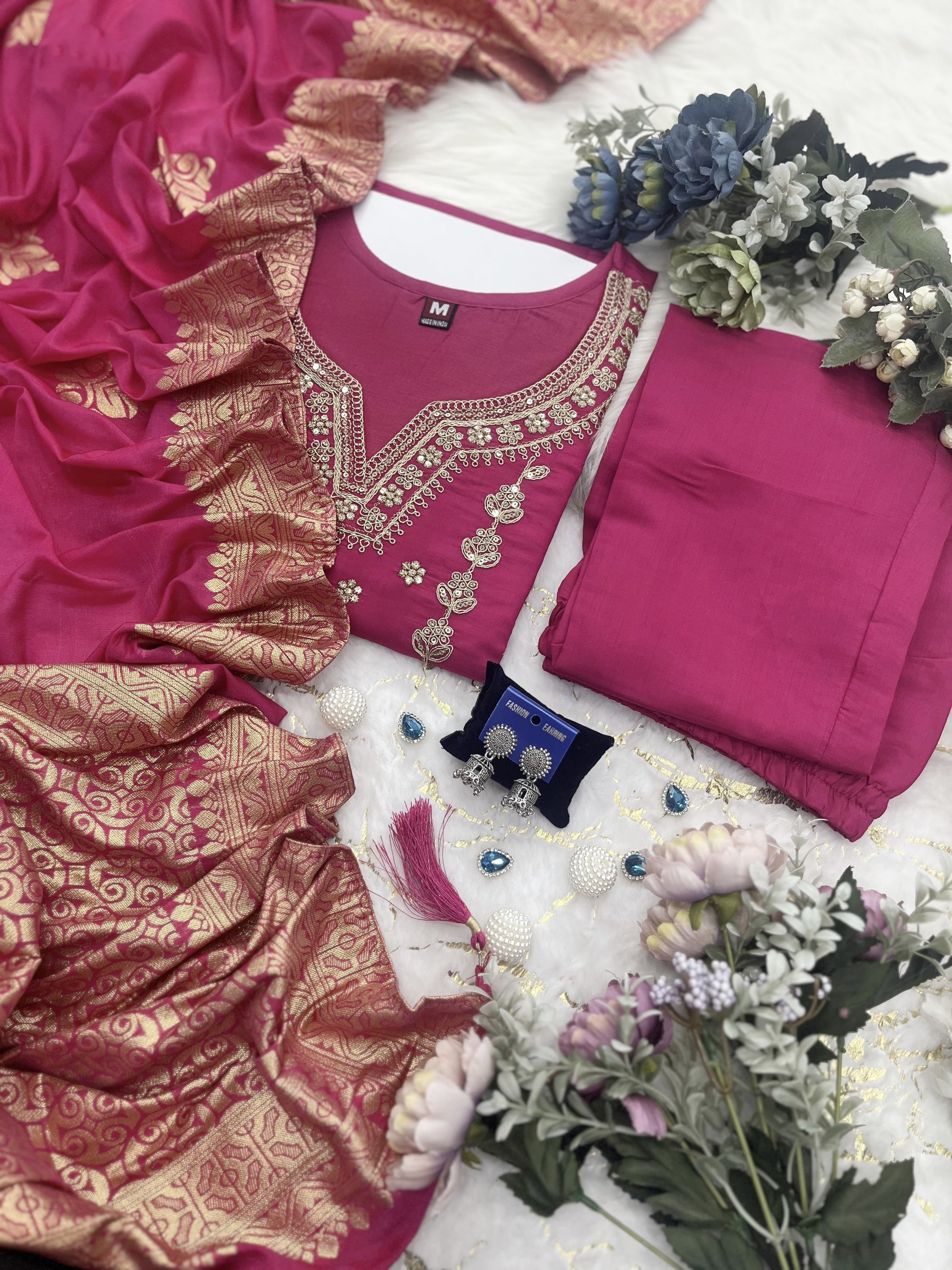 The Chanderi silk kurti set is a beautiful and elegant outfit that is perfect for special occasions. The set is made from Chanderi silk, a lightweight and breathable fabric that is known for its lustrous sheen and soft texture. The kurti is typically adorned with intricate embroidery or zari work, adding a touch of luxury and sophistication. The set is paired with matching pants or a skirt, and often includes a dupatta (scarf) that complements the ensemble.