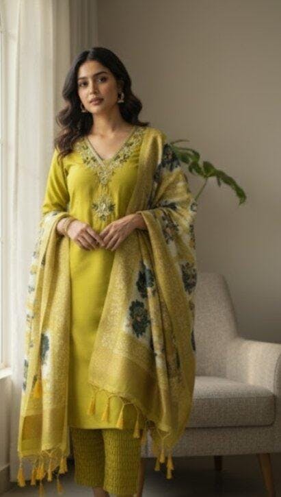 Elevate your ethnic wardrobe with this graceful Premium Roman Silk suit set in a stunning Parrot Green shade – perfect for festive moments or elegant day wear.