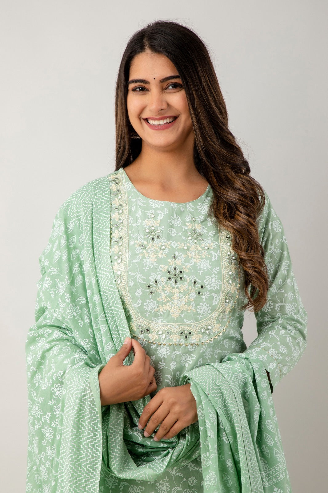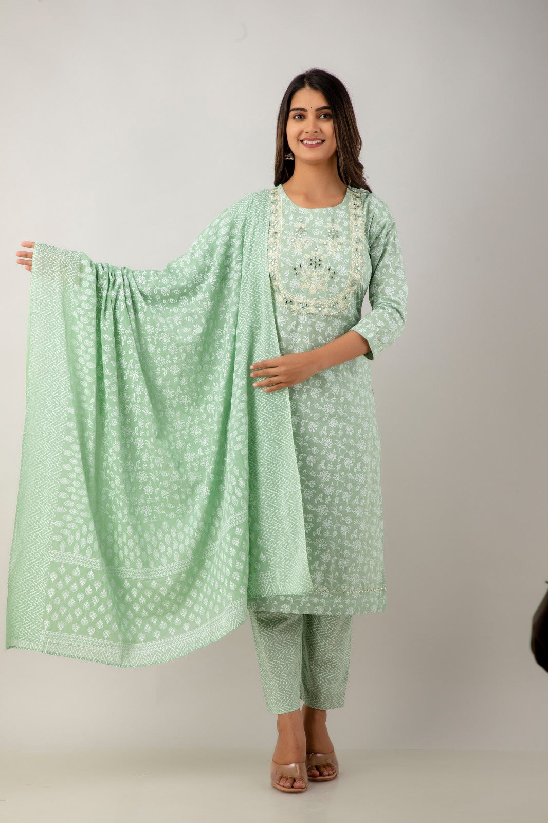 Beautiful cotton fabric printed kurta With hand embroidery work with cotton printed pant with pocket and cotton printed dupatta.