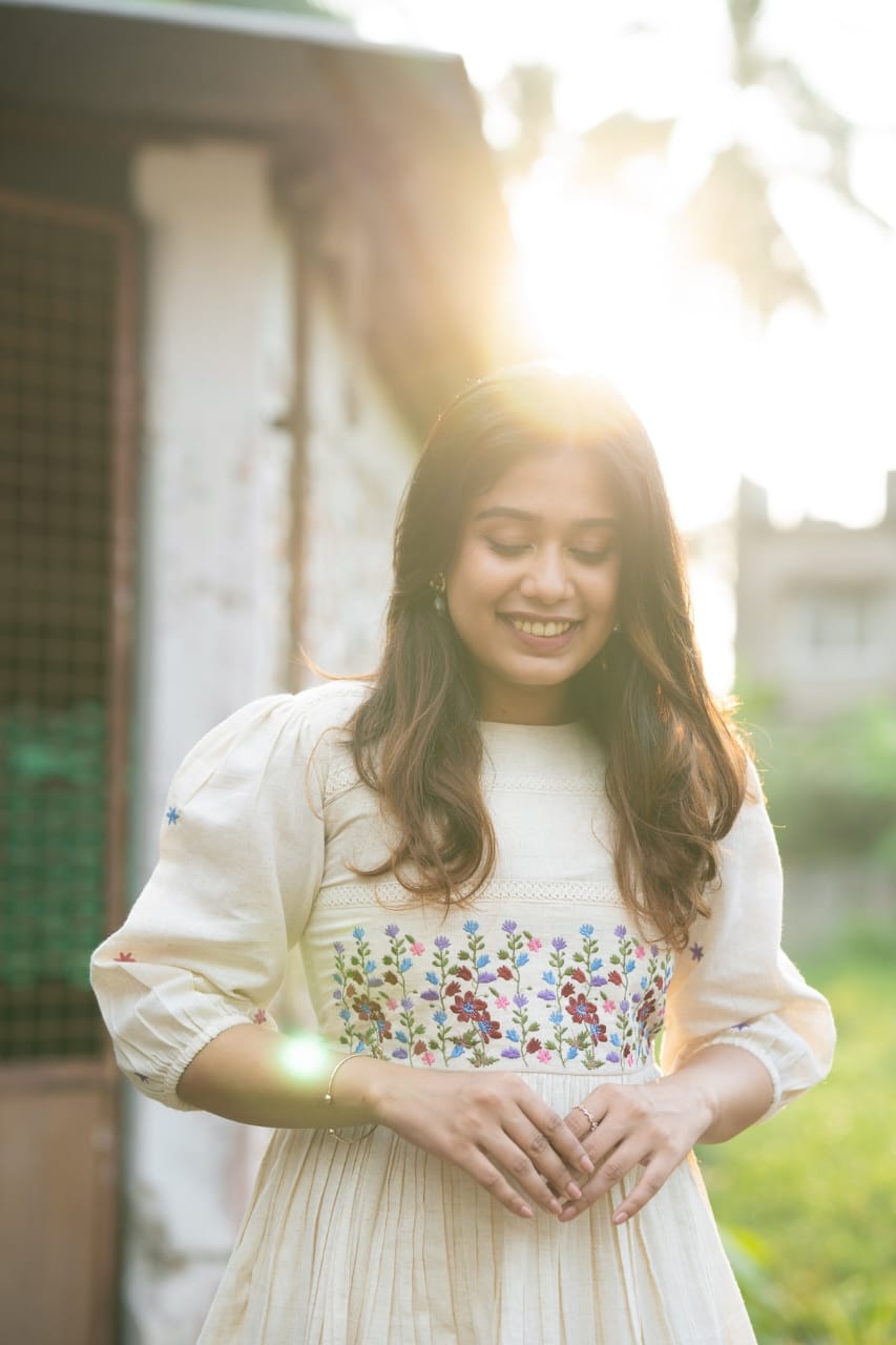A graceful off-white dress adorned with floral embroidery and crochet lace detailing on the yoke and sleeves. Designed for elegance and comfort, it’s the perfect blend of charm and style.