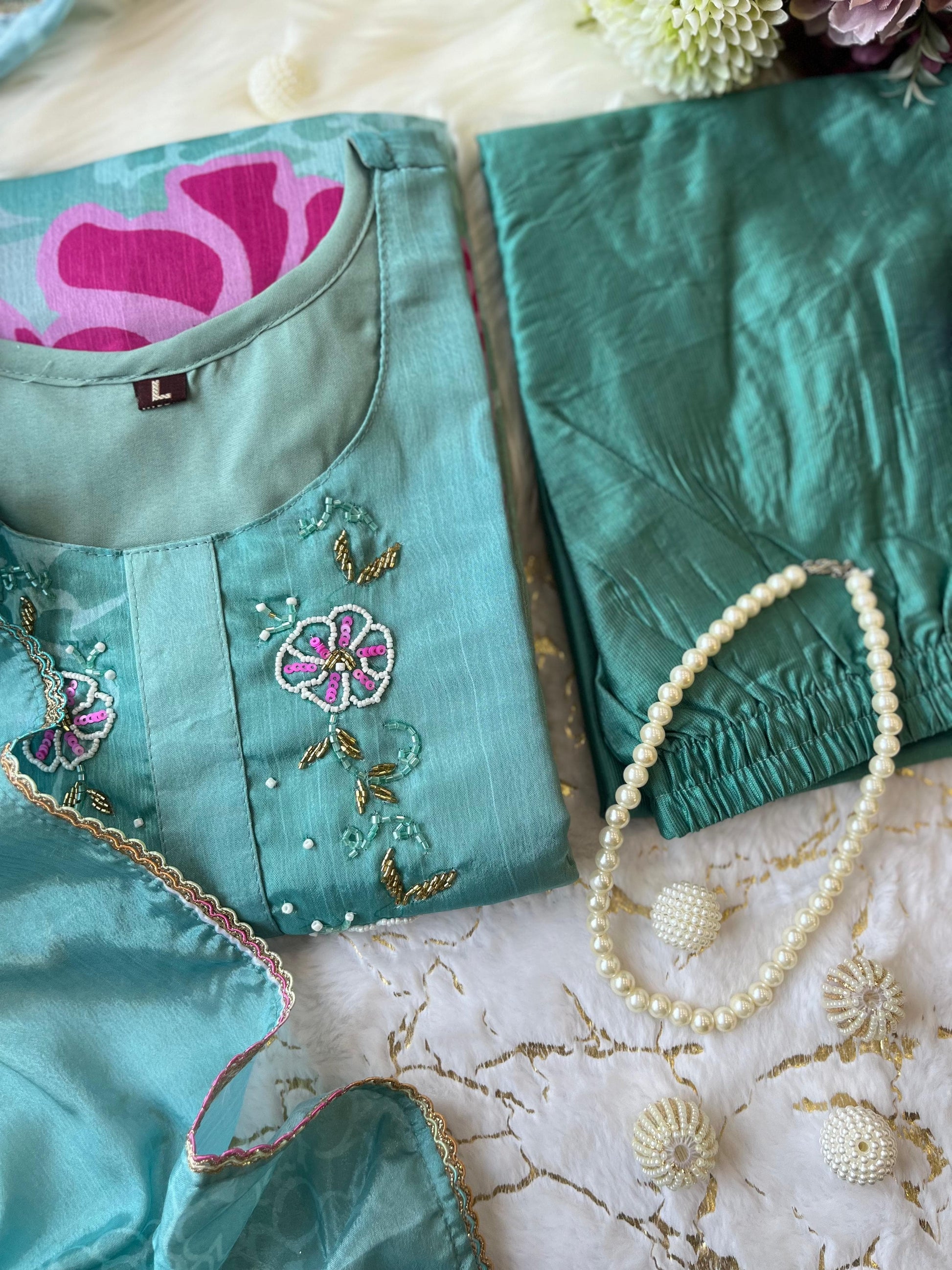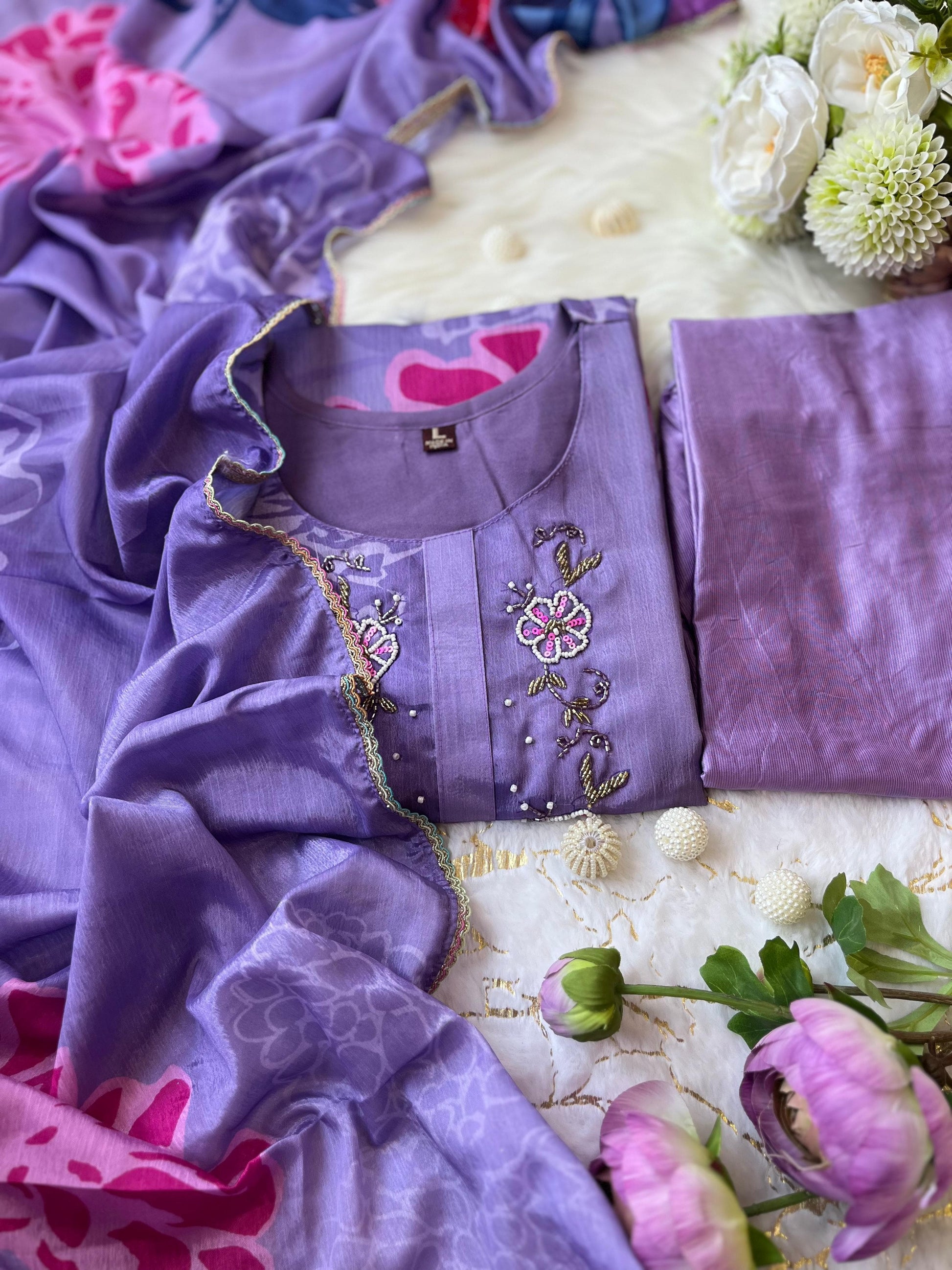 This Elegant 3-piece Kurta Set is Crafted From Luxurious Chinon Fabric,Offering a smooth & soft feel Perfect for any Occasion.