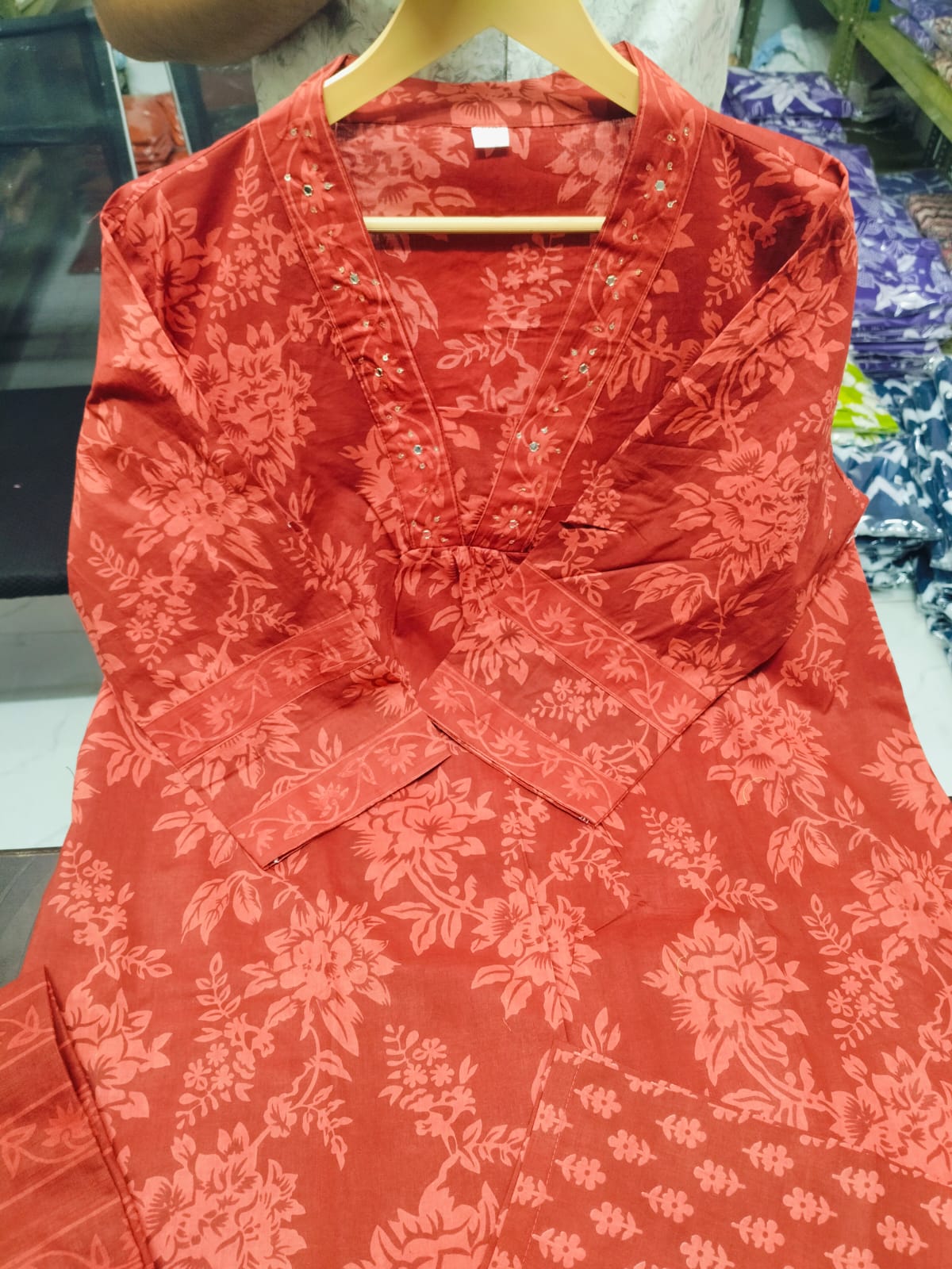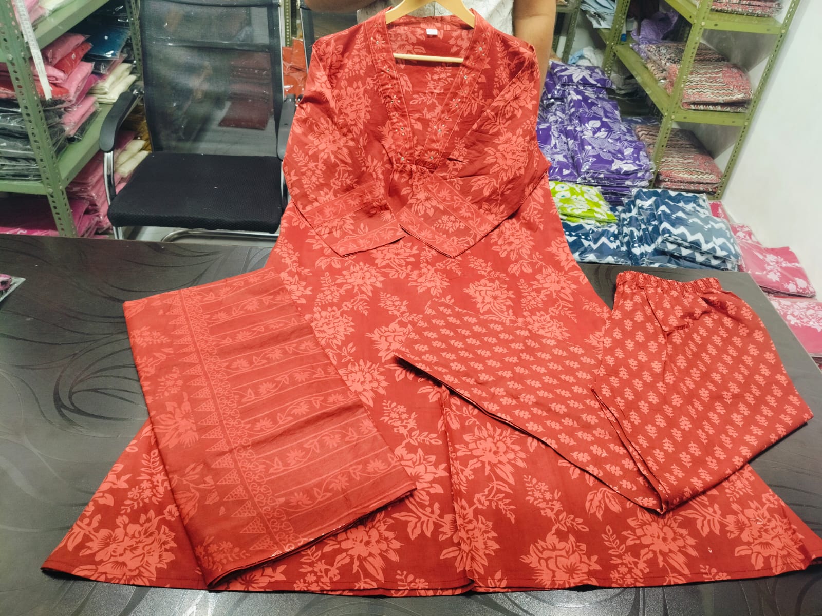 Designer three piece*V* Neck Yoke Mughal block kurta pant dupatta set in Premium fine flower Mul cotton with digital print