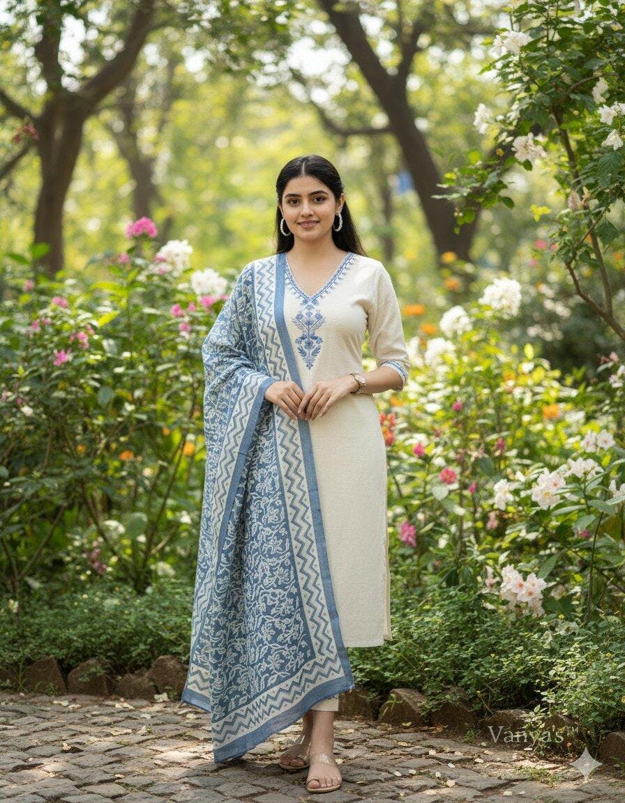 Pure Handloom khadi cotton weaving based fabric with all over embroidery. Paired with straight cotton pant. Embroidery on hems and beautiful shade with silk Dupatta.